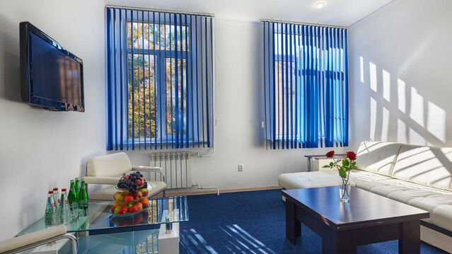 В номере: одна двуспальная кровать, прикроватные тумбочки, комплект постельного белья, гардеробная, диван раскладной, зеркало, комод, столик журнальный, стулья, набор посуды, телевизор ЖК, холодильник, электрочайник, санузел, душевая кабина, тапочки, туалетные принадлежности, халат, комплект полотенец.